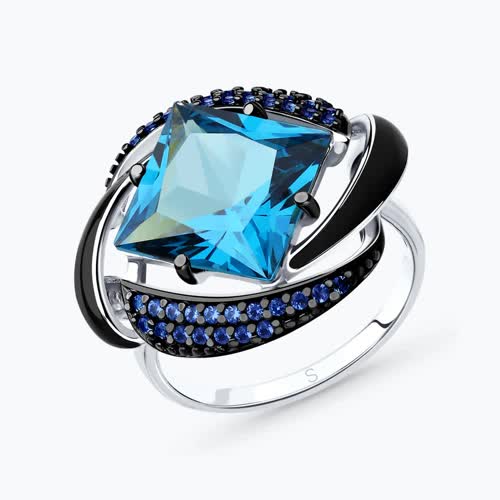 Кольцо из серебра с эмалью с синим ситаллом и синими фианитами