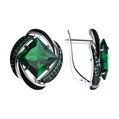 Серьги из серебра с эмалью с зелеными ситаллами и зелеными фианитами