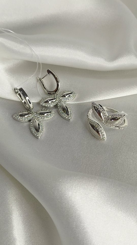 Серебряные серьги 925 пробы в форме листьев с фианитами